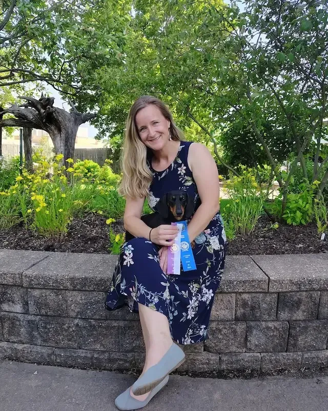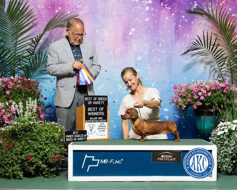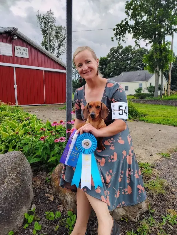 Milka is the beautiful result of a breeding partnership with our mentor, Laura Abbott Licht of Petalpusher Dachshunds. She is a daughter of our beloved Maple. Milka is maturing into a wonderful dog with excellent structure and a happy temperament. She is currently excelling in the show ring and is on the verge of completing her AKC Championship, requiring just one final major win to earn the title. When she's not out competing in the show ring, you can find her curled up on the couch under a blanket.